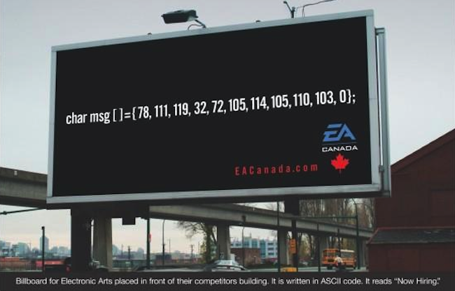 Similarly, a few years ago, Electronic Arts paid for a billboard that displayed its hiring message in the form of ASCII code. For tech onlookers, if they solved the line of code, they would get the message "Now Hiring."